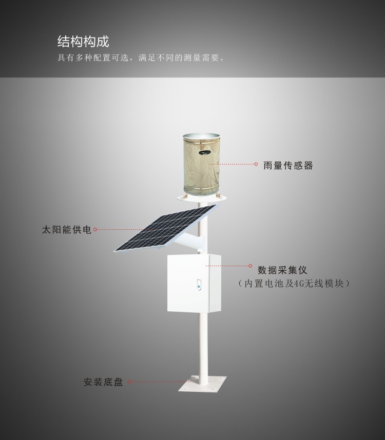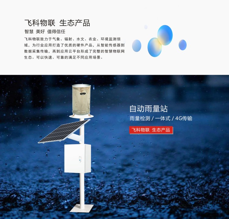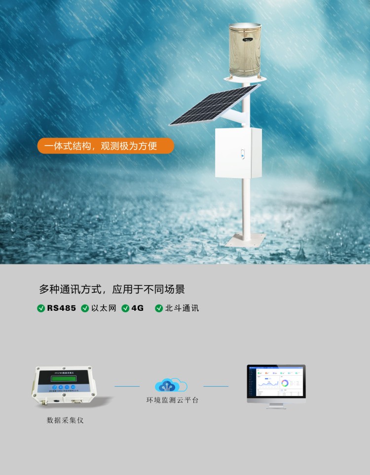 FY-WL100自動雨量站是用于測量雨量水文信息的自動觀測儀器。自動雨量站由數據采集儀、雨量傳感器、無線通訊模塊、太陽能供電系統、云平臺軟件等部分構成。數據采集儀用于采集及記錄雨量信息,并通過4G無線模塊向云平臺上報數據,系統采用一體式設計,安裝方便。