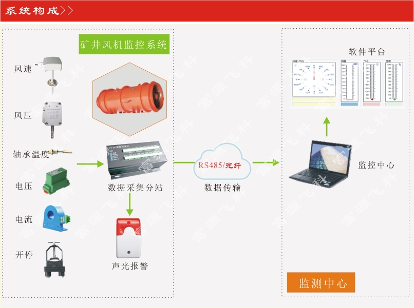 FY-KJ300煤礦井主通風(fēng)機(jī)監(jiān)測(cè)系統(tǒng)的設(shè)計(jì)是以《煤礦安全規(guī)程》為依據(jù),對(duì)煤礦井下實(shí)際情況進(jìn)行考察之后,綜合各方面的要求設(shè)計(jì)出來(lái)的,監(jiān)控設(shè)備的種類(lèi)、數(shù)量、性能符合《煤礦安全規(guī)程》的有關(guān)規(guī)定,適用各類(lèi)大中小型煤礦。該系統(tǒng)可采集風(fēng)速、溫度、甲烷、風(fēng)量、振幅等性能參數(shù),以及設(shè)備開(kāi)停、供電狀態(tài)等生產(chǎn)參數(shù),是煤礦安全生產(chǎn)的必備設(shè)備。