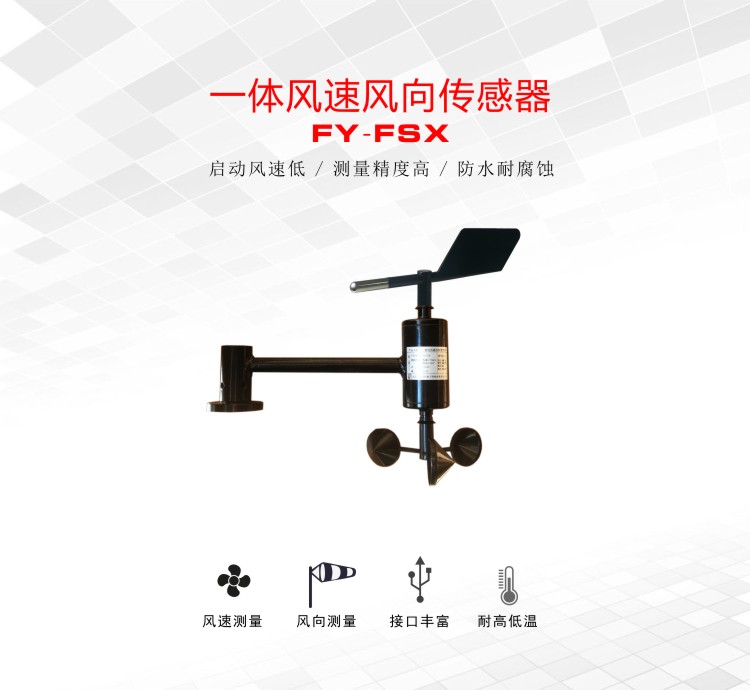 FY-FSX一體式風速傳感器采用一體式設計,用于測量風速和風向。外觀設計科學美觀,動力學特性好。風杯選用碳纖維材料,強度高,啟動好;風向傳感器采用低慣性風標,靈敏度高,精度高。本產品具有量程大、線性好、觀測方便、穩定可靠等優點。