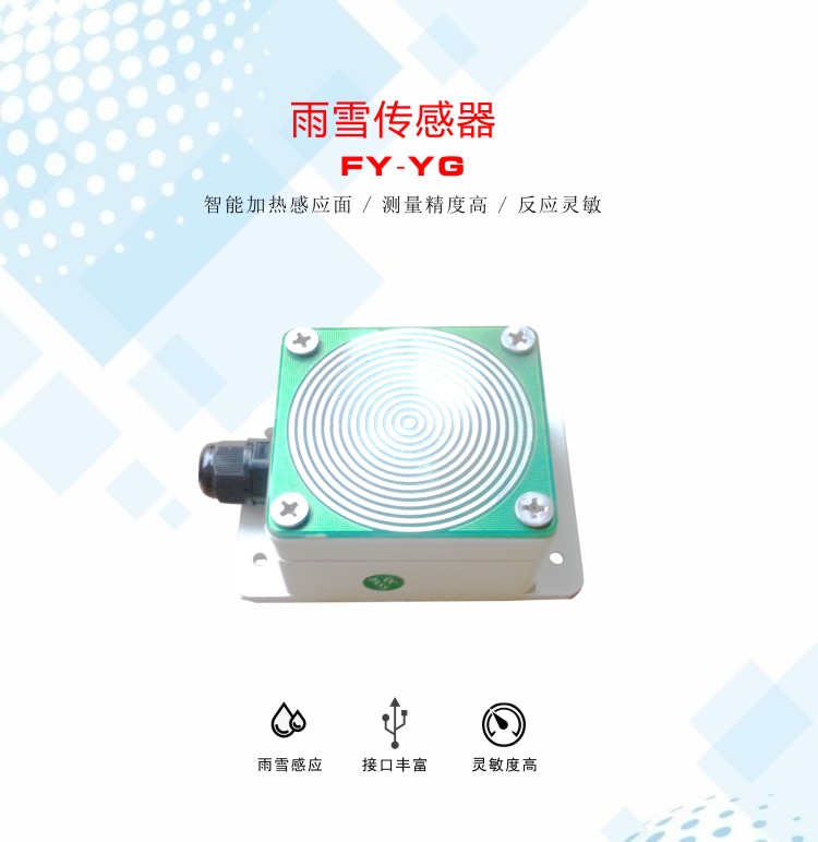 FY-YG雨雪感應器采用表面柵形電極感應外界雨雪情況,內部采用進口智能微處理器,反應靈敏、測量精度高。內置自動加熱裝置可排除雨雪附著的干擾,保障系統的正常運行。輸出為開關信號,方便安裝使用。本產品可廣泛用于氣象、海洋、環境、機場、港口、實驗室、工農業及交通等領域的雨雪有無定性測量。