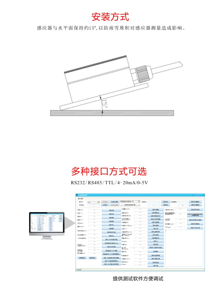 1、如圖所示,將2個M3×25螺絲穿過感應器前端的兩個安裝孔2個M3×35螺絲穿過感應器后端的兩個安裝孔,使感應器感應面與水平面保持約15°(以防雨、雪的堆積對感應器測量造成影響),將感應器固定在安裝座上;