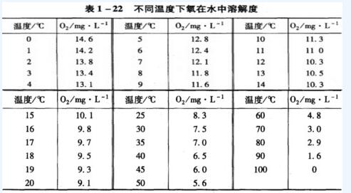地表水中溶解氧的含量與水溫、氣壓及水中有機物含量有關(guān)。表1—22給出了在水中不含有機物的情況下,O.1MPa大氣壓及不同溫度時,空氣中的氧在水中的溶解度。