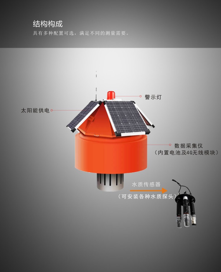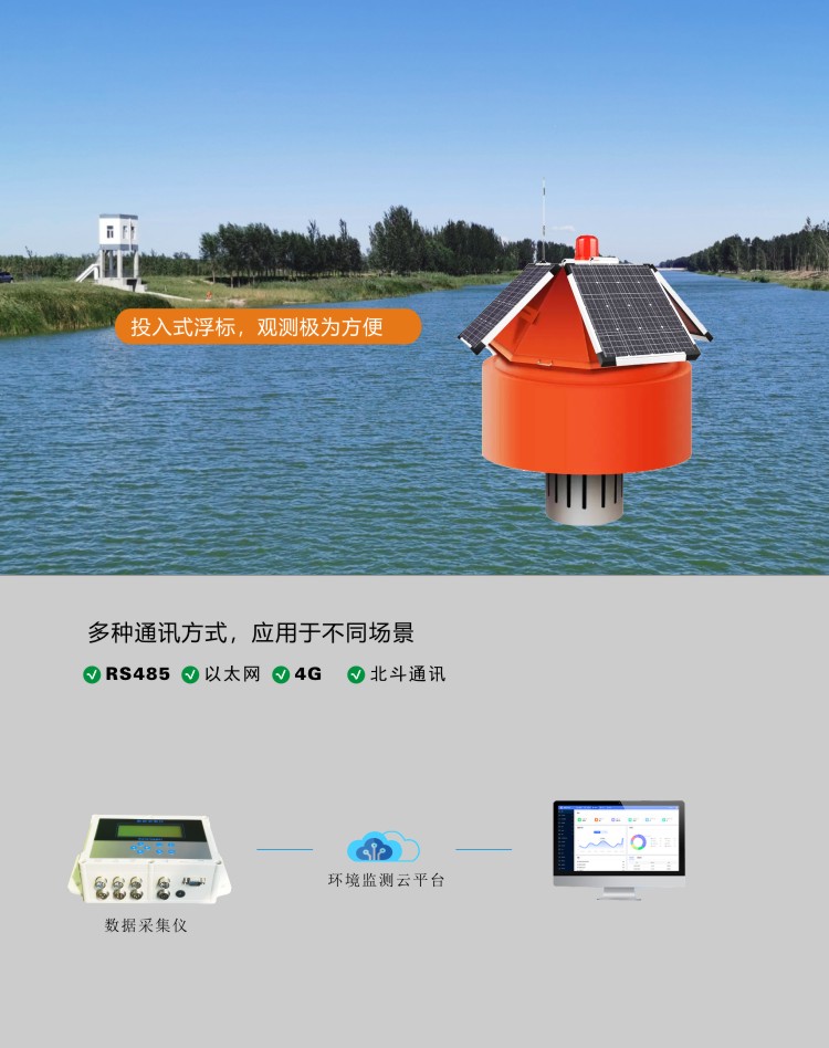 FY-WL2000浮標水質監測站采用360°圓形平臺,水下搭載多種水質探頭;水上可安裝多參數氣象、4G通信等系統。可對湖泊或長江流域內的水文、水質和氣象參數進行實時測量。系統集數據采集、顯示、存儲、傳輸于一體,并具有水文短信報警功能。具有測量參數多,測量精度高,存儲容量大,方便組網,運行穩定等特點。浮標采用無人值守的智能控制系統,完成對多個傳感器的控制以及數據的發送;太陽能電池板和大容量蓄電池組成太陽能供電系統,可保證系統在野外長期工作所需用電;浮標標體使用超高分子聚乙烯材料制作,具有較好的防腐能力、防止生物附著、不褪色、無毒性、抗碰撞能力強、抗雷電、無磁性等特點,適宜于水庫等復雜的水文水動力條件。