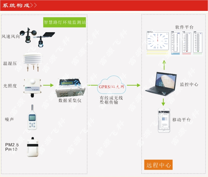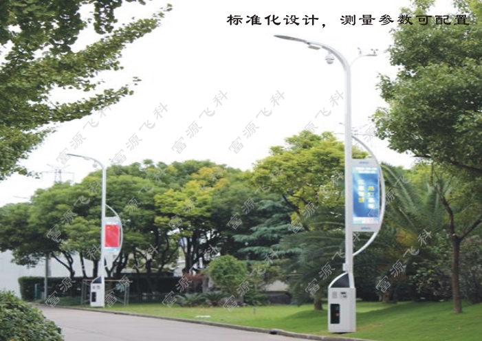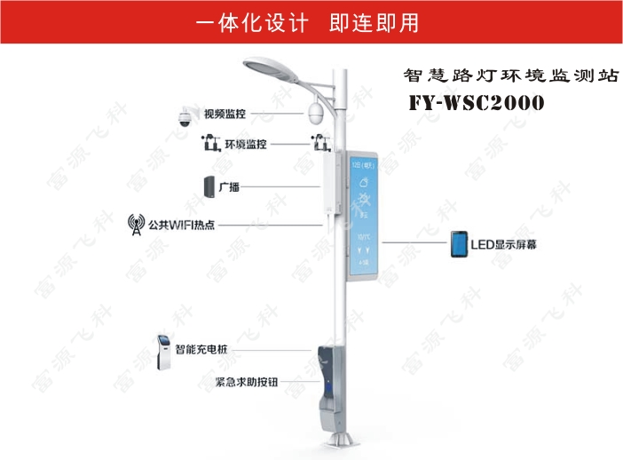 FY-WSC2000智慧路燈環境監測站可集成在智慧照明路燈燈桿,通過智慧路燈的網格化布局,實現對城市環境的實時在線監測。常規監測數據包括風速、風向、溫度、濕度、氣壓、光照度、紫外、環境噪聲、PM2.5、PM10等,監測要素可根據需要進行選配。