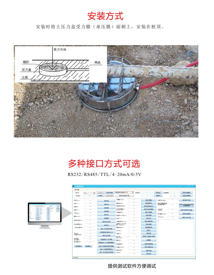 土應(yīng)力測(cè)量是土體力學(xué)研究和土木工程研究的重要手段,F(xiàn)Y-ZTP土壤應(yīng)力傳感器采用不銹鋼結(jié)構(gòu),微加工硅膜片為核心元件,利用國(guó)際先進(jìn)的微型化制作與封裝工藝,進(jìn)行了精致巧妙的封裝,產(chǎn)品體積小,結(jié)構(gòu)緊湊,重量輕,堅(jiān)固耐用,且具有優(yōu) 良的動(dòng)靜態(tài)特性,該系列產(chǎn)品特別適合土木模擬,離心機(jī)模擬等使 用,廣泛應(yīng)用于巖土力學(xué)、土體力學(xué)、土木工程以及爆破試驗(yàn)中。