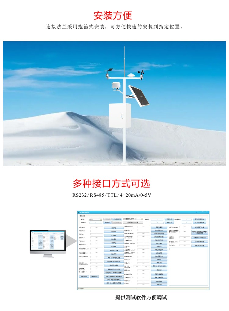 FY-TPRH多要素氣象百葉箱采用進口高精度傳感芯片,具有測量精度高、穩定性好等特點??蓪囟取穸?、氣壓、光照、噪聲、PM2.5、雨雪等同步進行測量,具有防雨防塵罩,可戶外長期使用??蓮V泛用于工地、氣象、海洋、環境、機場、港口、實驗室、工農業及交通等領域的溫度測量。