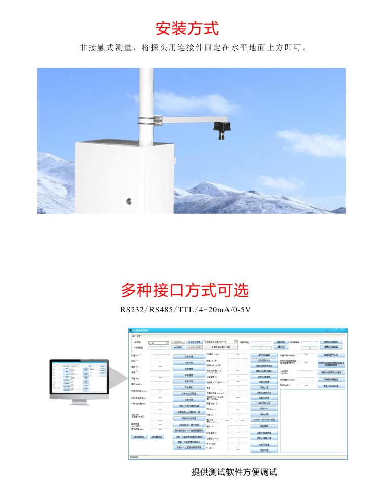 FY-SNL超聲波雪深傳感器是一種采用超聲波遙測(cè)技術(shù)的將雪過(guò)程監(jiān)測(cè)紀(jì)錄分析設(shè)備。它可以測(cè)量并記錄積雪深度、時(shí)段降雪量等。應(yīng)用于氣象臺(tái)站雪深觀測(cè)、交通沿線積雪測(cè)量、滑雪場(chǎng)氣象服務(wù)等領(lǐng)域。