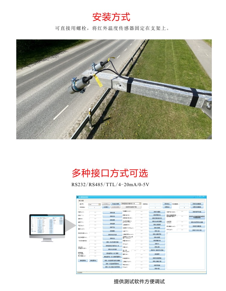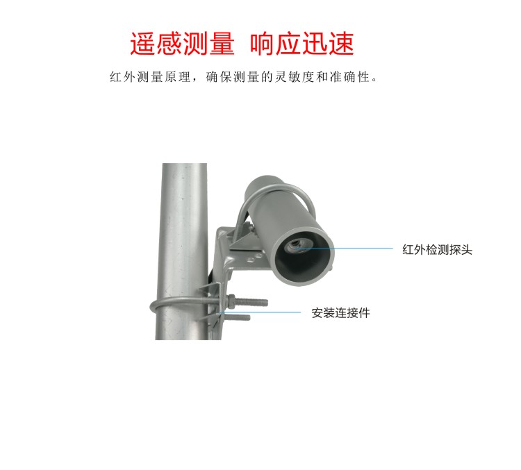 FY-IRT2紅外溫度傳感器內(nèi)部由一個熱電堆和一個熱敏電阻構(gòu)成。所有的物體都在不停地向周圍空間發(fā)出紅外輻射能量,通過對其自身輻射的紅外能量的測量,便能準確地測定它的表面溫度 ,這就是非接觸紅外測溫的原理。紅外測溫儀可完全不接觸目標,而通過測量目標發(fā)射的紅外輻射強度計算出物體的表面溫度,這是它最大的優(yōu)點。傳感器防護套易于安裝,90°可調(diào)支架,可滿足各種野外條件下安裝和進行不間斷測量。