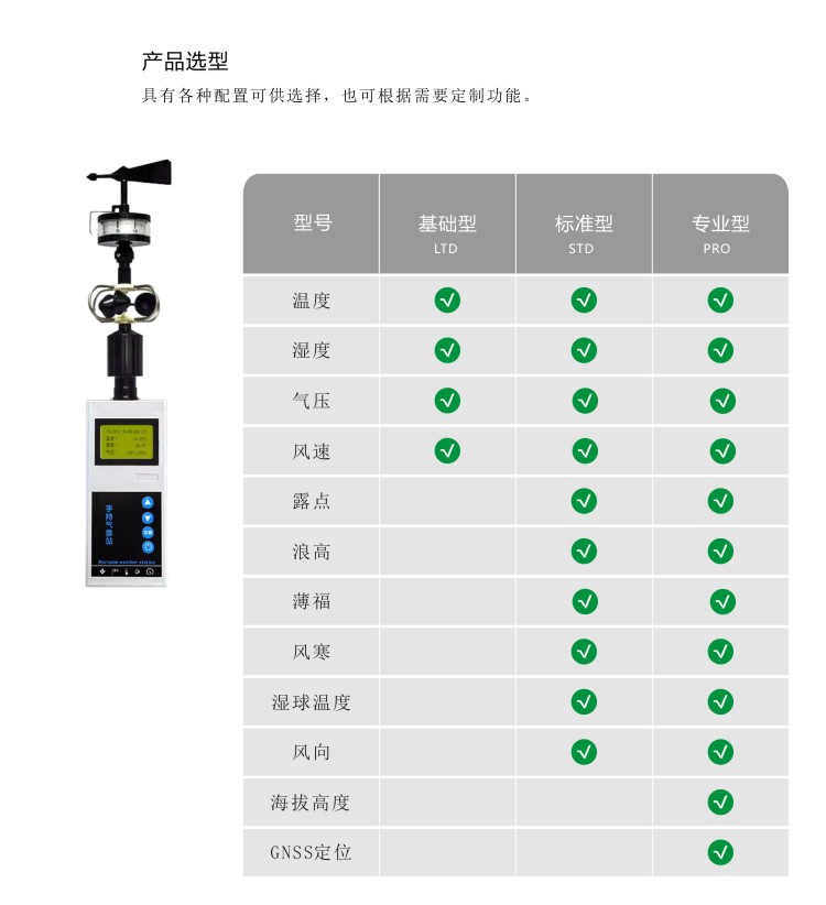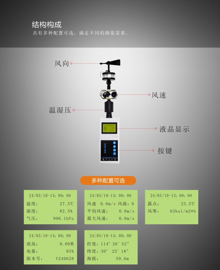 手持式氣象站是一款攜帶方便,操作簡單,集多項氣象要素于一體的可移動式氣象觀測儀器。系統(tǒng)采用精密傳感器及智能芯片,用于測量風速,風向、溫度,濕度,露點,大氣壓力,BF 薄福,風寒指數,海拔高度等數據,并可擴展GPS定位功能。內置大容量FLASH存儲芯片可存儲至少一年的氣象數據;通用USB通訊接口,使用配套的USB線纜即可將數據下載到電腦,方便用戶對氣象數據的進一步處理分析。本儀器可用于農林、環(huán)保、海洋、科學考察等領域。
