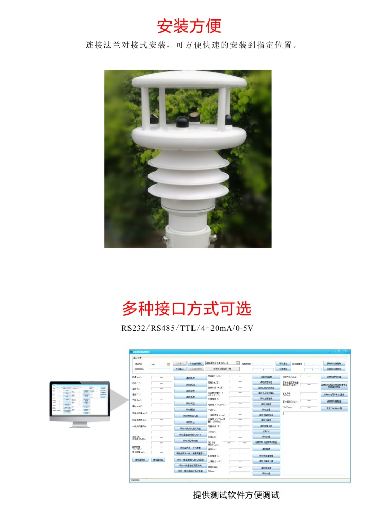 FY-QC6超聲波多要素傳感器采用高頻超聲波來(lái)測(cè)量風(fēng)速和風(fēng)向,解決了傳統(tǒng)機(jī)械式測(cè)風(fēng)儀機(jī)械磨損的難題,沒(méi)有移動(dòng)部件,測(cè)量精度更高,性能更加可靠。超聲波探頭可以精確測(cè)量出風(fēng)速和風(fēng)向。并集成了溫度、濕度、氣壓、PM2.5、輻射、光照、噪聲等。傳感器具有4個(gè)超聲波探頭。兩個(gè)探頭一組,進(jìn)行相互收發(fā)。在無(wú)風(fēng)的環(huán)境下,從每一個(gè)探頭發(fā)出的超聲波到達(dá)對(duì)面探頭的時(shí)間都是一樣的;當(dāng)有風(fēng)的情況下,風(fēng)會(huì)影響超聲波到達(dá)對(duì)面探頭的時(shí)間,通過(guò)計(jì)算探頭之間超聲波傳輸時(shí)間差,可以計(jì)算出當(dāng)時(shí)的風(fēng)速和風(fēng)向。傳感器內(nèi)部具有一個(gè)微處理器,可以通過(guò)4個(gè)探頭的測(cè)量數(shù)據(jù)來(lái)計(jì)算出合成風(fēng)速和風(fēng)向。在整個(gè)過(guò)程中,傳感器同時(shí)測(cè)量空氣溫度,來(lái)對(duì)聲速在不同溫度下的變化進(jìn)行補(bǔ)償。雷達(dá)式雨量探頭,可以快速準(zhǔn)確的測(cè)量雨量強(qiáng)度。