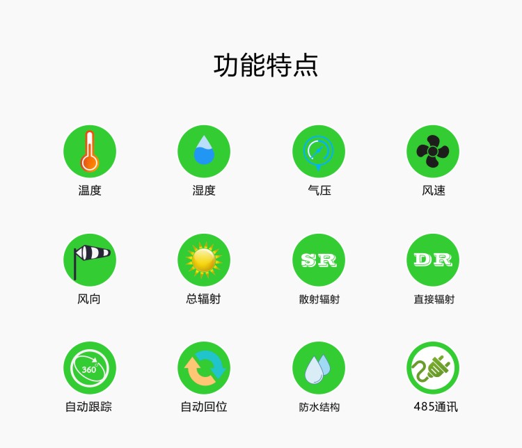 ●標準RS232/485/USB通訊功能,支持標準MODBUS通訊協議,可以通過有線 連接、局域網連接、光纖連接、GPRS移動通訊、數傳電臺、等多種通訊方式與光伏氣象站接收服務器組成氣象監測系統;