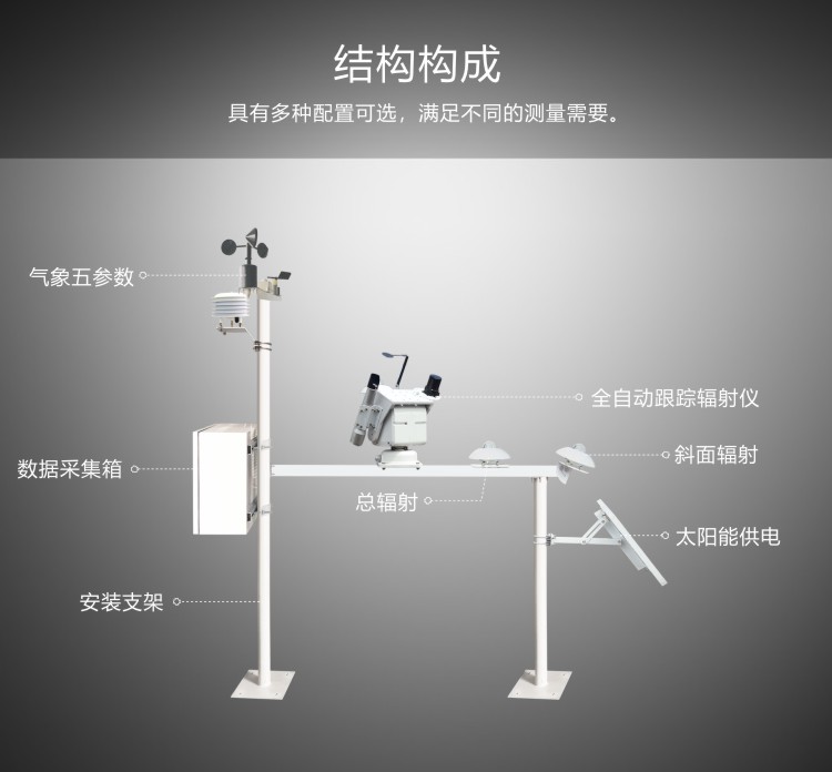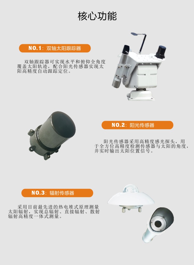 FY-SQ200型光伏電站環境監測系統可觀測的環境輻射要素有:環境溫度、濕度、氣壓、組件溫度、風速、風向、傾斜總輻射、日照時數、水平總輻射、太陽直接輻射、太陽散射輻射等指標。具有性能穩定,檢測精度高,完全自動化監測等特點,可滿足光伏電站環境氣象監測、太陽輻射監測等相關要求。
