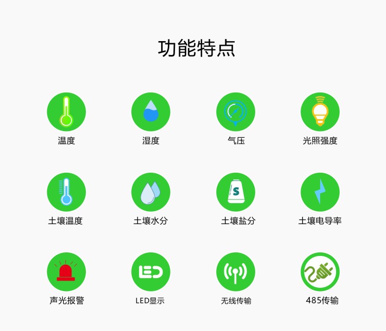●測(cè)量溫度、濕度、氣壓、光照、土溫、土濕、鹽分、電導(dǎo)率;