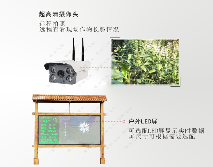 可同時測量并顯示氣溫、相對濕度、土壤溫度、土壤濕度、雨量、蒸發、風速、風向、PM2.5、氣壓、太陽總輻射、光照度、二氧化碳等。