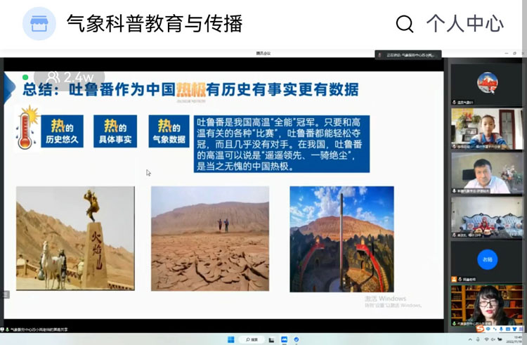 為做好科普向未來工作和進(jìn)一步推動(dòng)全國中小學(xué)氣象科普知識(shí)進(jìn)校園活動(dòng),豐富孩子們的科普知識(shí),并收獲更多快樂和見聞;在中國科普研究所和中國氣象學(xué)會(huì)主辦下,由河南、新疆、安徽氣象學(xué)會(huì)聯(lián)合湖北公眾氣象服務(wù)中心以及相關(guān)地區(qū)氣象局、教育部門、學(xué)校等多部門聯(lián)合共同開展《探秘我國熱極氣象 云游火焰山》為主題的氣象科普知識(shí)直播課程活動(dòng)。邀請新疆公眾氣象服務(wù)中心蘇小嵐高級(jí)工程師、編導(dǎo)為大家?guī)怼短矫匚覈鵁針O氣象 云游火焰山》授課,帶我們一起學(xué)習(xí)新疆地域氣象特點(diǎn),感受探尋吐魯番氣候特點(diǎn)和人文景觀以及絲綢之路。