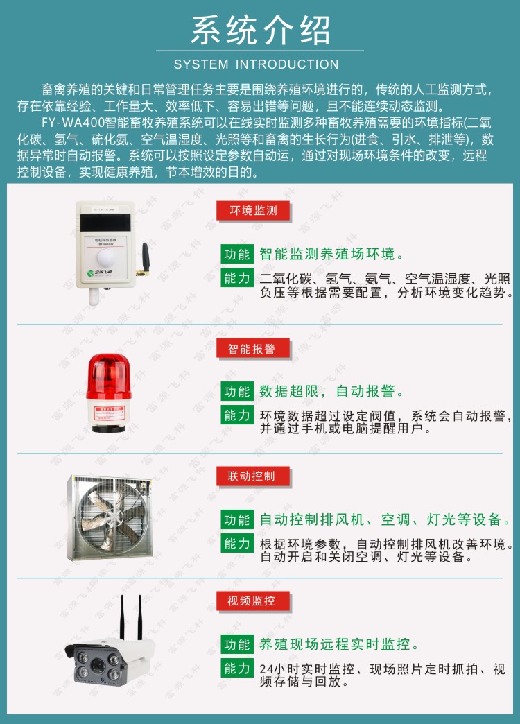 FY-WA400智能畜牧養(yǎng)殖系統(tǒng)可以在線實時監(jiān)測多種畜牧養(yǎng)殖需要的環(huán)境指標(biāo)(二氧化碳、氫氣、硫化氨、空氣溫濕度、光照等和畜禽的生長行為(進食、引水、排泄等),數(shù)據(jù)異常時自動報警。系統(tǒng)可以按照設(shè)定參數(shù)自動運,通過對現(xiàn)場環(huán)境條件的改變,遠程控制設(shè)備,實現(xiàn)健康養(yǎng)殖,節(jié)本增效的目的。