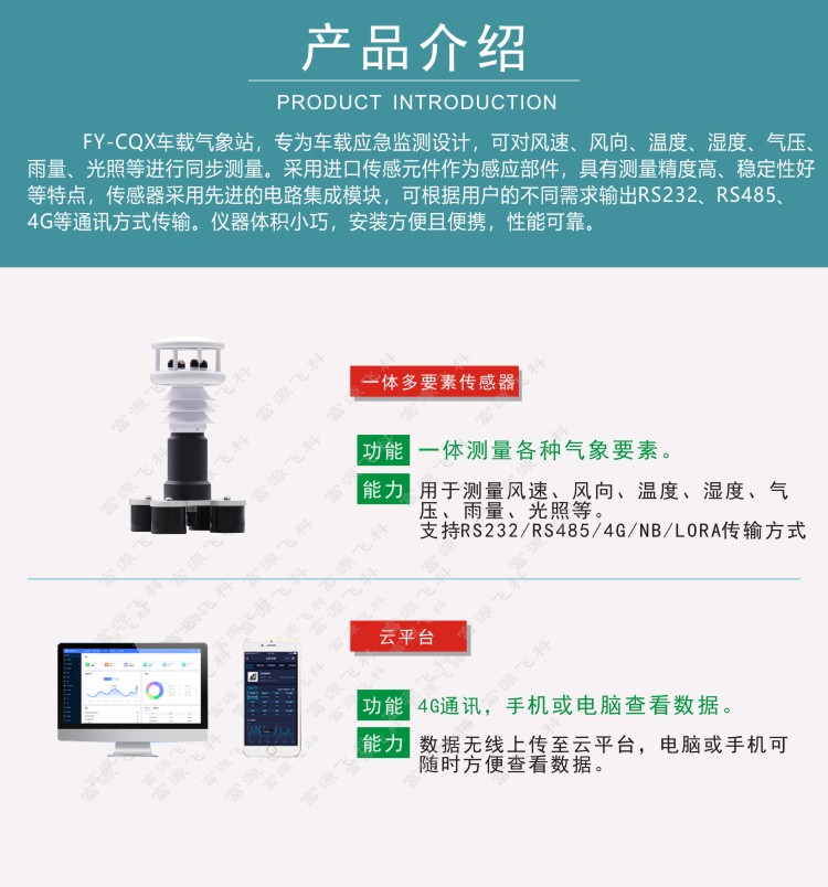 FY-CQX車載氣象站,專為車載應急監測設計,可對風速、風向、溫度、濕度、氣壓、雨量、光照等進行同步測量。采用進口傳感元件作為感應部件,具有測量精度高、穩定性好等特點,傳感器采用先進的電路集成模塊,可根據用戶的不同需求輸出RS232、RS485、4G等通訊方式傳輸。儀器體積小巧,安裝方便且便攜,性能可靠。