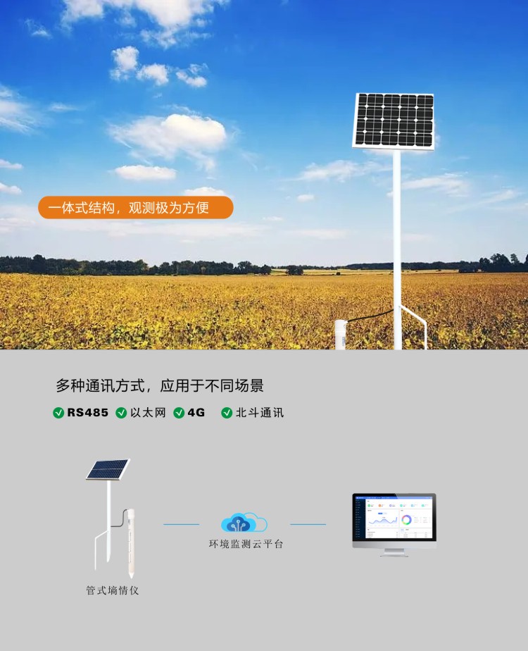 FY-SQ1000管式土壤墑情監測站能夠實現對土壤墑情(土壤濕度、土壤溫度)的長時間連續監測。傳感器采用介電常熟原理設計,產品符合《中華人民共和國水利行業標準SL364-2006土壤墑情監測規范》的時域反射(TDR)技術。可同時監測3-5層土壤參數,數據直接通過4G上傳至云端。云服務器可同步處理多個墑情站點的數據,進行不間斷監測,對土壤墑情的發生、發展及變化進行實時的監視和分析,為開展排澇抗旱工作提供信息依據。