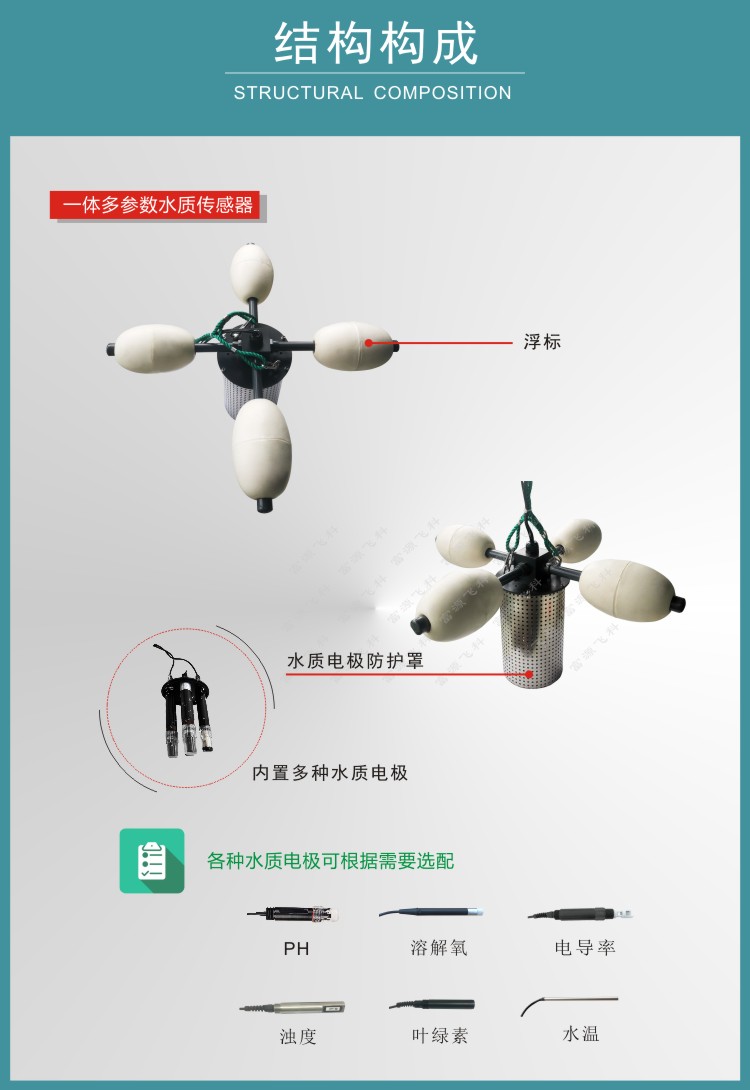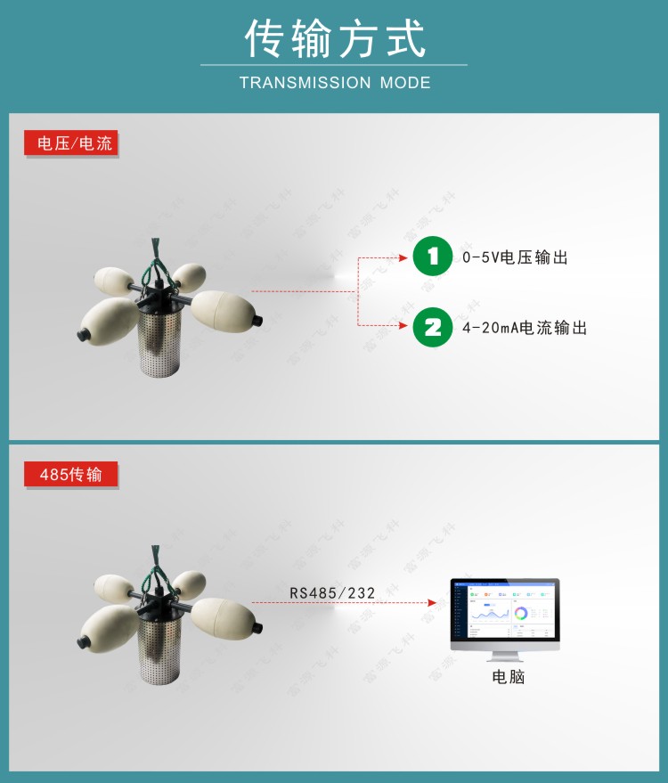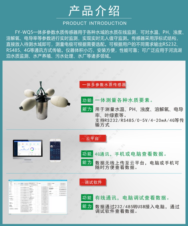 FY-WQ5一體多參數水質傳感器用于各種水域的水質在線監測,可對水溫、PH、濁度、溶解氧、電導率等參數進行實時監測,實現實時無人值守監測。傳感器采用浮標式結構,直接放入待測水域即可,測量電極可根據需要選配??筛鶕脩舻牟煌枨筝敵鯮S232、RS485、4G等通訊方式傳輸。儀器體積小巧,安裝方便,性能可靠;可廣泛應用于河流湖泊水質監測、水產養殖、污水處理、水廠等諸多領域。