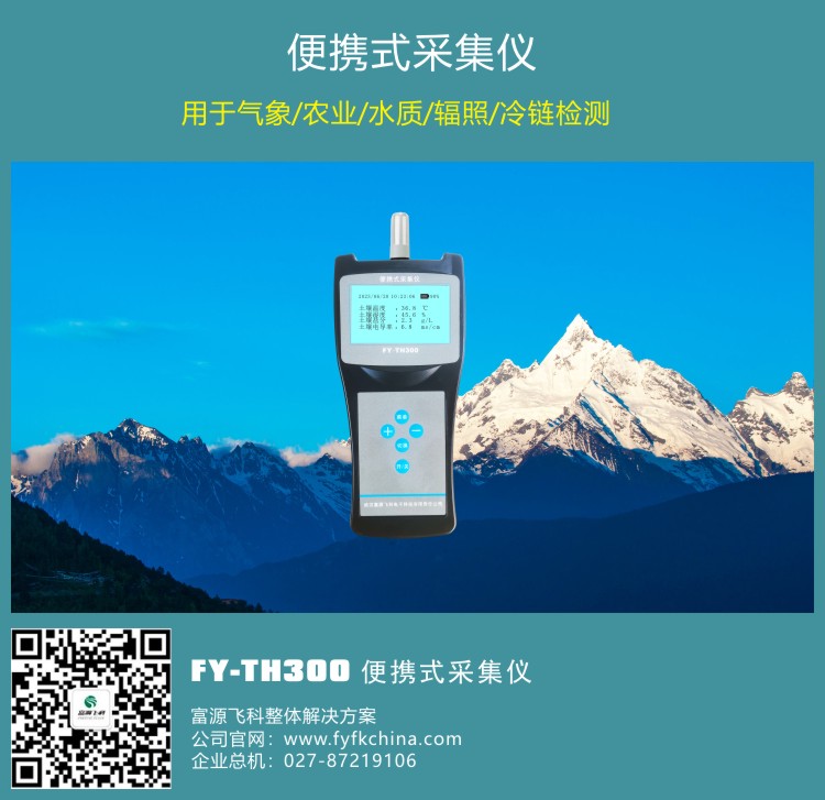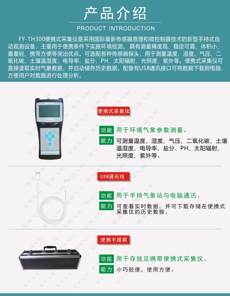 FY-TH300便攜式采集儀是采用國際最新傳感器原理和微控制器技術的新型手持式自動觀測設備,主要用于便攜條件下實施環境檢測。 具有測量精度高、穩定可靠、體積小、重量輕、攜帶方便等突出優點。可選配各種傳感器探頭,用于測量溫度、濕度、氣壓、二氧化碳、土壤溫濕度、電導率、鹽分、PH、太陽輻射、光照度、紫外等。便攜式采集儀可直接讀取實時氣象數據,并自動儲存歷史數據。配備有USB通訊接口可將數據下載到電腦,方便用戶對數據進行處理分析。