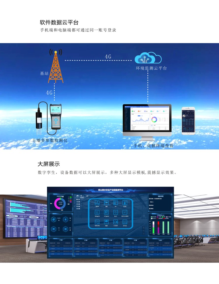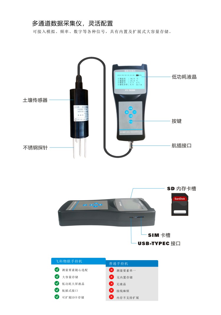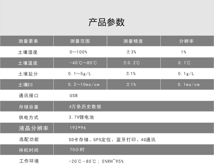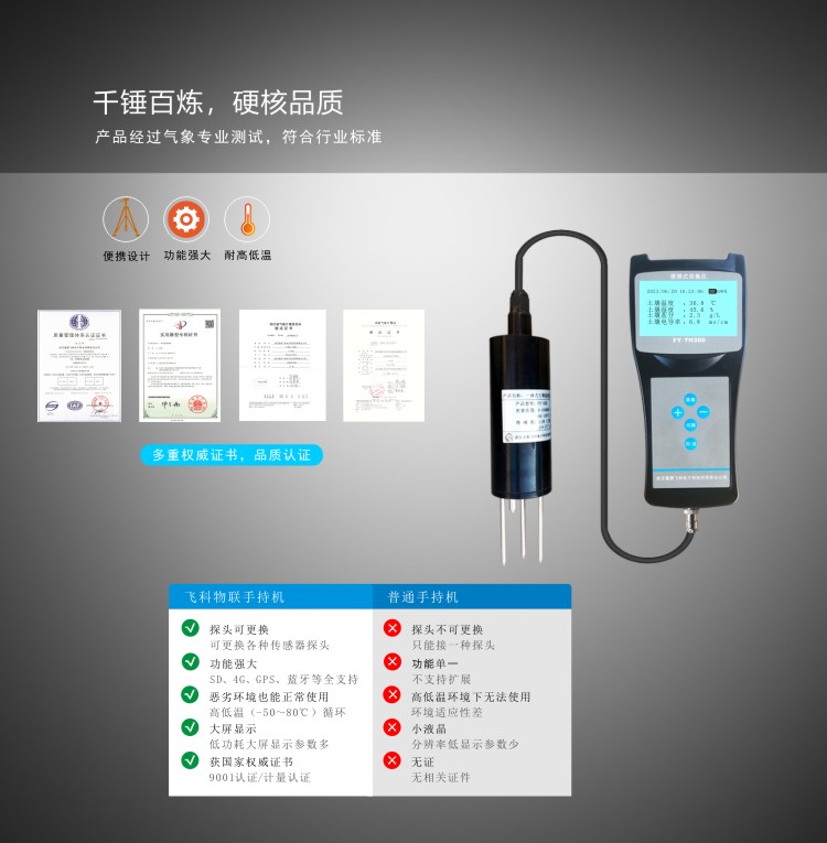 FY-TH300A土壤多參數檢測儀是一款攜帶方便,操作簡單的便攜式土壤檢測設備。低功耗大屏液晶,可同時顯示土壤溫度、土壤水分、土壤鹽分、土壤電導率等,內置大容量FLASH存儲芯片可存儲4萬條歷史數據;通用USB通訊接口,使用配套的USB線纜即可將數據下載到電腦,也可通過4G將數據傳輸至云平臺,方便用戶對氣象數據的進一步處理分析。