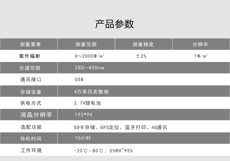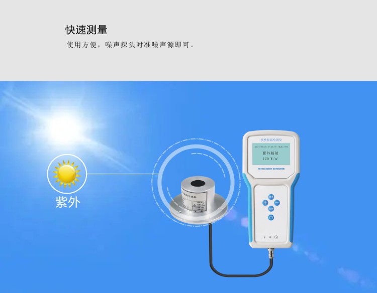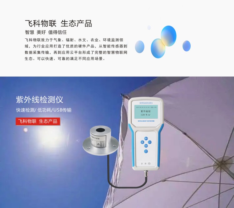 FY-TH300紫外輻射檢測儀是一款攜帶方便,操作簡單的便攜式環境檢測設備。低功耗大屏液晶時顯示紫外輻射值,可測量UVAB光譜范圍范圍內紫外線強度。內置大容量FLASH存儲芯片可存儲4萬條歷史數據;通用USB通訊接口,使用配套的USB線纜即可將數據下載到電腦,也可通過4G將數據傳輸至云平臺,方便用戶對氣象數據的進一步處理分析。
