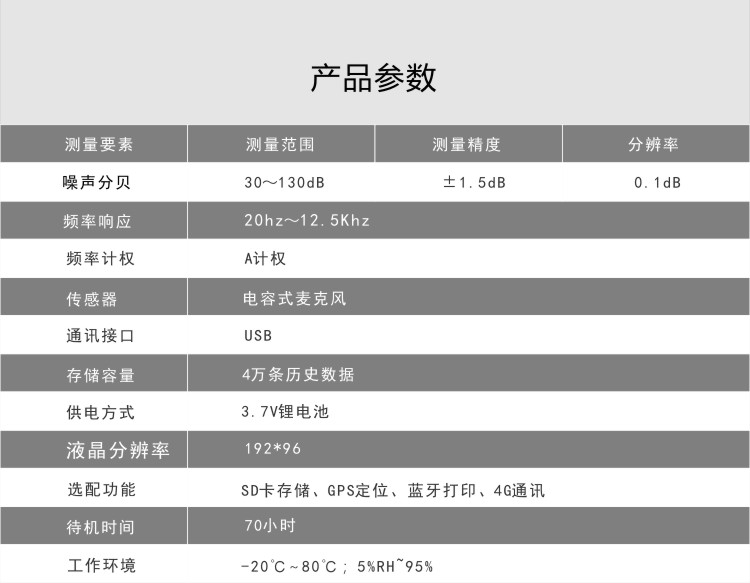 FY-TH500噪聲檢測儀是一款攜帶方便,操作簡單的便攜式環境檢測設備。低功耗大屏液晶時顯示噪聲分貝值,測量范圍寬,可滿足所有噪聲檢測要求。內置大容量FLASH存儲芯片可存儲4萬條歷史數據;通用USB通訊接口,使用配套的USB線纜即可將數據下載到電腦,也可通過4G將數據傳輸至云平臺,方便用戶對氣象數據的進一步處理分析。
