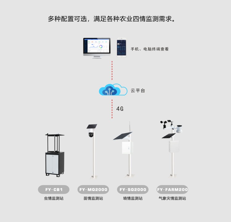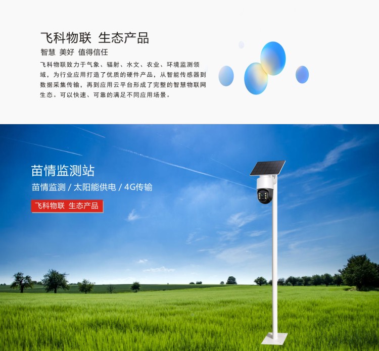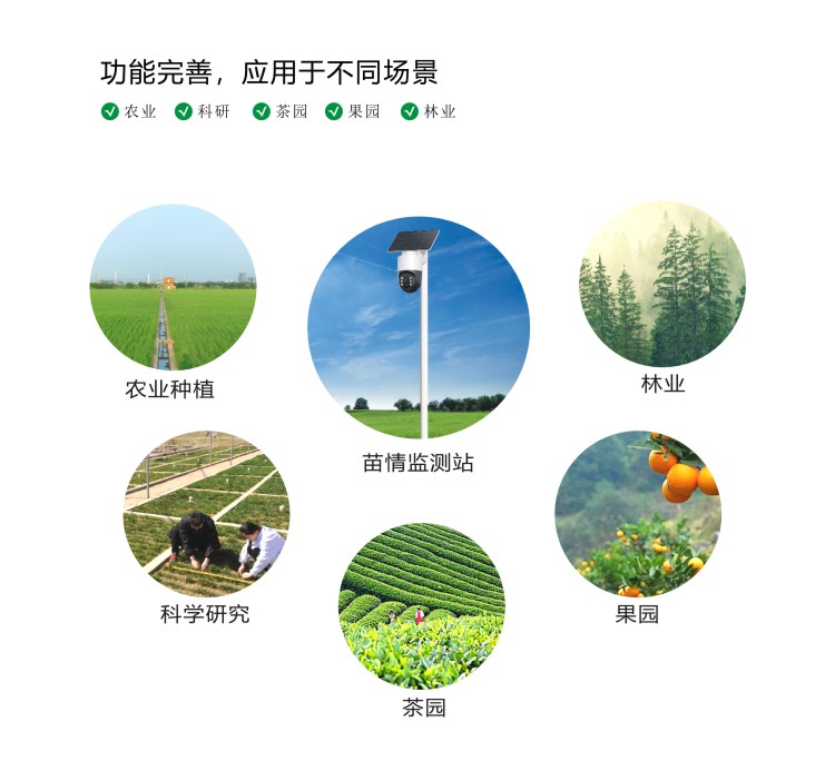 FY-MQ2000苗情監(jiān)測系統(tǒng)用于對(duì)農(nóng)作物的生長發(fā)育狀態(tài)、病蟲害情況以及災(zāi)情進(jìn)行實(shí)時(shí)視頻監(jiān)控。產(chǎn)品采用 4G 無線傳輸,支持太陽能供電。結(jié)合氣象、墑情等傳感器以及蟲情預(yù)報(bào)燈等,可以對(duì)田間苗情、蟲情、災(zāi)情實(shí)現(xiàn)全方位自動(dòng)監(jiān)測,使用戶可以遠(yuǎn)程關(guān)注作物生長狀況,根據(jù)作物在不同生長周期的需求,指導(dǎo)灌溉、施肥、噴藥等措施。