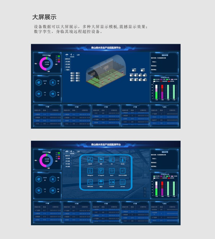 溫室數據可以大屏展示,多種大屏顯示模板,數字孿生,身臨其境遠程管理設備。